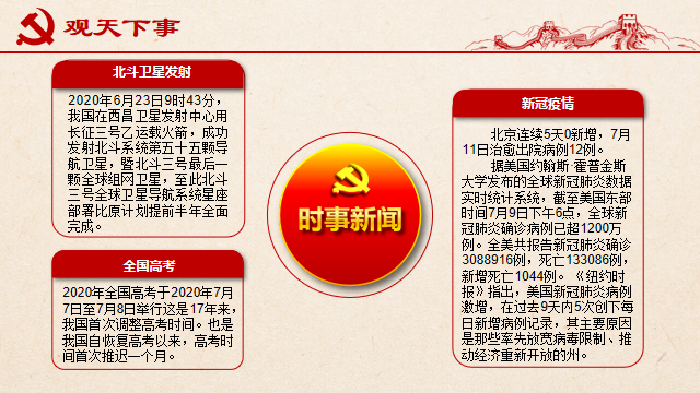 在本次会议中,徐婧雨带领同学们回顾了北斗卫星全球组网完成,2020年高考在推迟一个月后成功进行,北京新冠疫情得到控制,近日中央气象台继续发布暴雨黄色预警,全国多地会出现暴雨等强对流天气等时事新闻。通过了解国内外大事,增强了同学们的国家自信心和民族认同感,并提醒同学们在进行旅游、探亲等外出活动时要关注天气、注意安全。