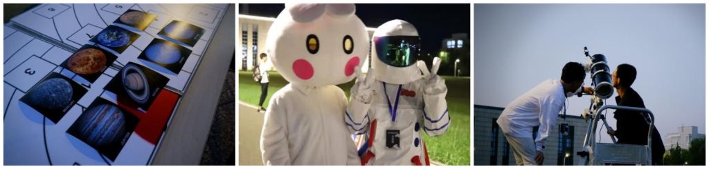 北航新闻网9月26日电(通讯员 张泽宇 门雪洁)金秋送爽,丹桂飘香,喜迎建党百年,共度中秋佳节。为了营造喜庆热烈的节日氛围,传播中华民俗文化,科普中国探月成就,空间与环境公司于9月21日与22日晚在沙河校区举办“空小环邀你来望月——写意环宇,月盈星河”中秋特色活动,通过天文望远镜观测月球及土星、木星,科普探月工程和宇宙空间知识,通过投壶、猜灯谜等游戏体验中华传统民俗的魅力。沙河校区各公司、书院近千名师生参与本次活动。