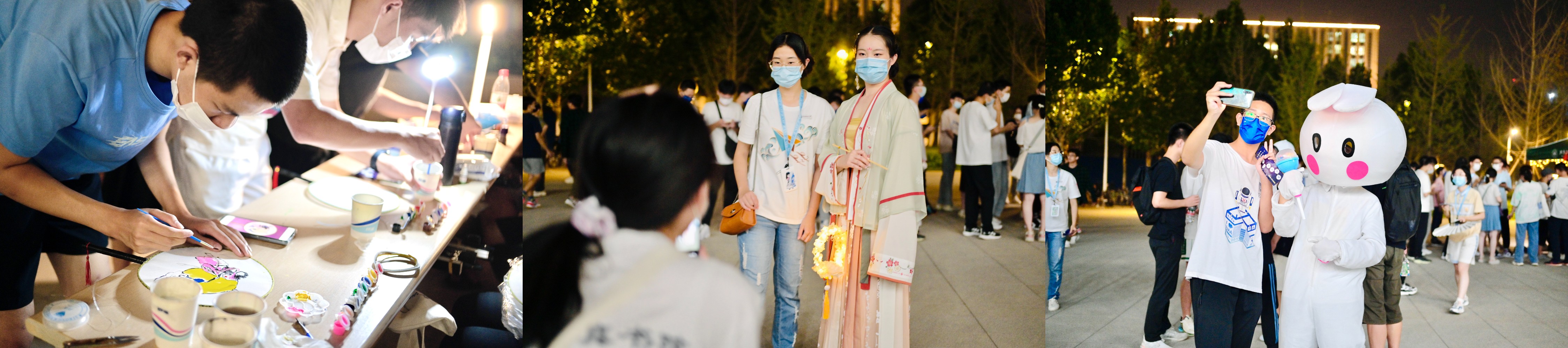 西区食堂的“月桂吟游”区中,“谜语千秋”猜灯谜,同学们提灯赏月,灯下解谜,时而眉头紧锁,时而恍然大悟;“扇中笔墨”画扇子,在团扇和折扇上畅意挥墨,随心涂鸦,快意潇洒;“一掷乾坤”投壶雅戏,一掷中的,声声清脆,与同学们的欢声笑语一起汇成交响。“嫦娥”“玉兔”穿行其间,嫦娥仙气飘飘,玉兔可爱动人,引得同学争相合影。玻璃窗面上映照着融入夜色的花灯,星星点点,如落满天星,营造出喜庆欢乐的节日氛围。