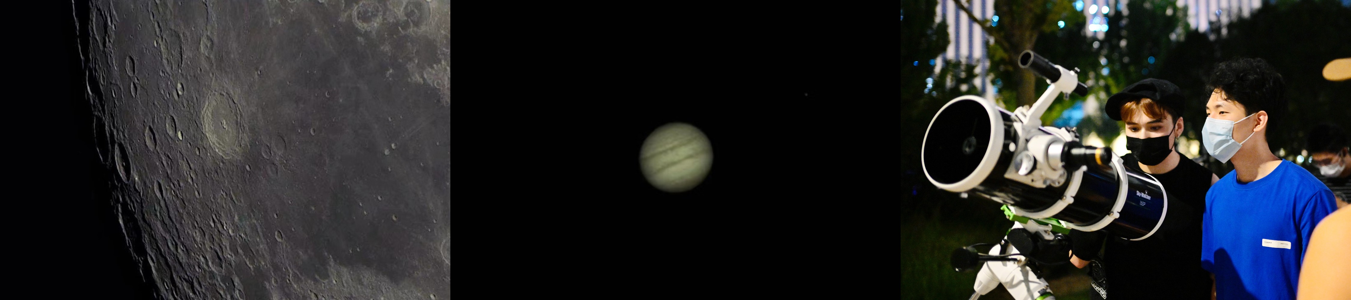 “环宇航途”区还搭建了四台天文望远镜。从目镜中望去,映入眼帘的便是一轮暗红玉盘,难得的红月别有风采,恰逢木星合月的天象,星月争辉,竞放光芒。星特朗C9.25望远镜中的天文美景,通过行星相机投影至大屏幕,来来往往的同学们都能欣赏到高清的月球表面图像,现场即兴讲解更是吸引大家驻足聆听。琼楼玉宇下,仿佛置身天外,与星辰对话,共诉诗篇,不禁感叹,好一个“千里共婵娟”!