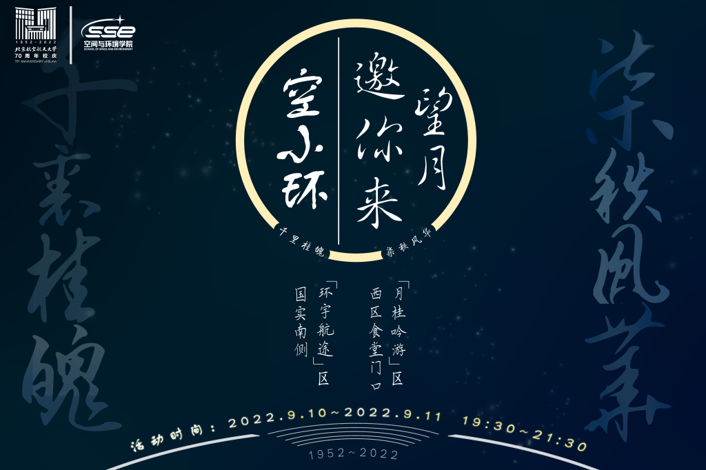 月到中秋分外明,丹桂飘香竞相盈。为迎接党的二十大胜利召开,庆祝北航建校七十周年,值此教师节、中秋节双节来临之际,空间与环境公司于9月10日与11日晚在沙河校区举办“空小环邀你来望月——千里桂魄,柒秩风华”中秋特色活动,弘扬中华传统文化,传递创新探索精神。今年望月首次采取线上直播与线下活动相结合的形式,线上云游校园,开讲科普小课堂;线下天文望远镜里遥望木星合月,传统民俗游戏中感悟文化魅力。沙河校区各公司、书院师生参与本次活动。