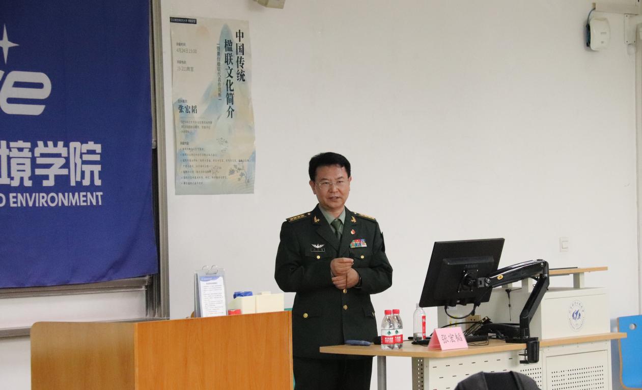 张宏韬从《楹联丛话》所描述的五代后蜀主孟昶创作的第一幅春联讲起,详细介绍了楹联的概念与哲学探源;从对仗的语言基础、格式演化带领大家对楹联对仗形式寻根,通过对立特征的共存介绍了楹联丰富的基本特征,对用途、字数、技巧等深入讲解了楹联的不同分类,强调了楹联创造的基本标准、形式、联律与禁忌;最后,结合校园陈列、军旅所见、民间流传的舞台楹联与历史典故一起进行了深入赏析,生动形象地介绍了无数楹联所歌咏的历史人物和抒发的爱国情怀。