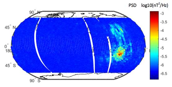 感应式磁力仪在轨工作期间监测到了来自地面NWC(澳大利亚)、HWU(法国)、GBZ(英国)和NPM(美国)等多个高功率长波台站发射的甚低频电磁波信号。图1201842327日感应式磁力仪在顶部电离层探测到的19.8kHz电磁波的全球功率谱分布。数据分析表明,它来自南半球西澳大利亚埃克斯茅斯NWC台站(21.82°S114.17°E)发射的VLF电磁波信号。该电磁波沿着磁力线传播到北半球时再次被感应式磁力仪探测到。