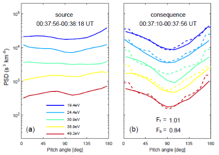 电子回旋冷却的观测特征为:在磁矩(第一绝热不变量)守恒的条件下,局部磁场减弱导致了电子在垂直方向的通量减少(图2)。符慧山教授课题组借助于MAVEN卫星的探测数据,首次在火星的空间环境中发现了这一物理过程。他们对电子分布函数进行了详细分析,发现在火星磁尾,热电子、超热电子和高能电子都发生了回旋冷却;同时,他们建立了一个物理模型,并利用该模型对电子回旋冷却进行了定量计算,发现该模型能够成功复现所观测到的物理现象(图3),从而定量地解释了火星磁尾的电子回旋冷却过程。