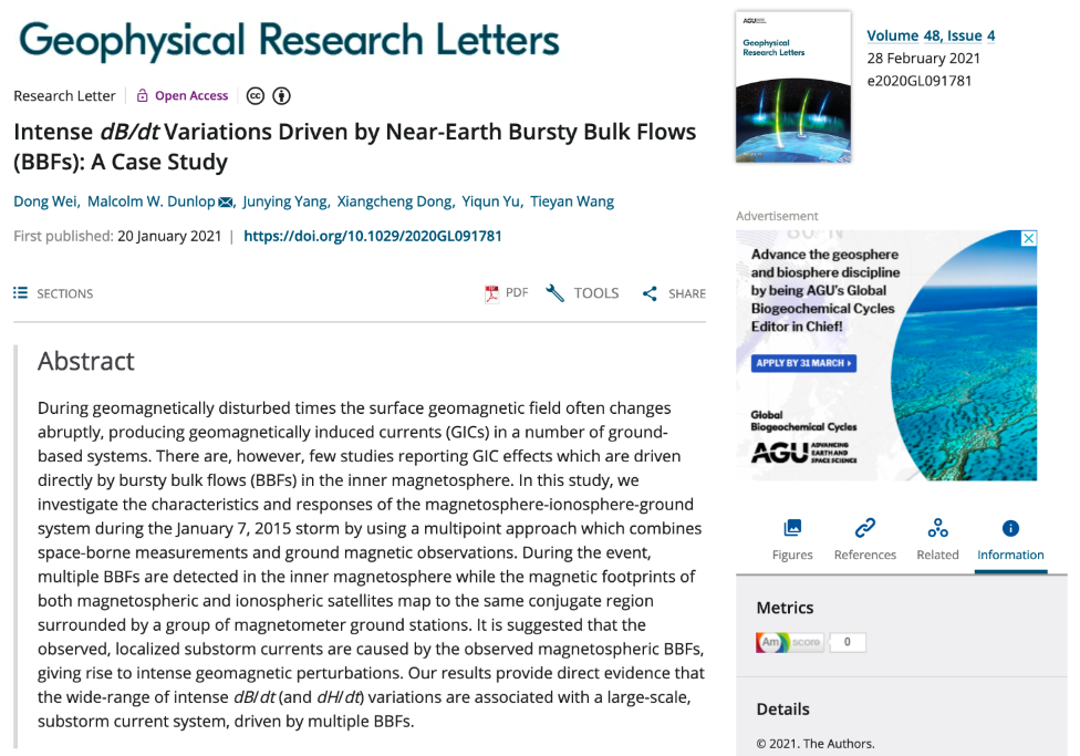 近日,空间科学系Malcolm Dunlop教授等人,利用欧洲空间局(ESA)两个旗舰卫星计划Cluster和Swarm的探测数据,首次发现地球上空的磁层空间爆发性高速粒子流驱动地磁场剧烈扰动的直接观测证据。研究成果发表在国际空间物理权威期刊《地球物理学研究快报》(Geophysical Research Letters)上(图一)。欧洲空间局网站以“Swarm and Cluster get to the bottom of geomagnetic storms”为题报道了这一新发现。该研究成果也被欧洲空间局评为亮点成果。博士生魏冬为论文的第一作者,Malcolm Dunlop教授为第二作者兼通讯作者。