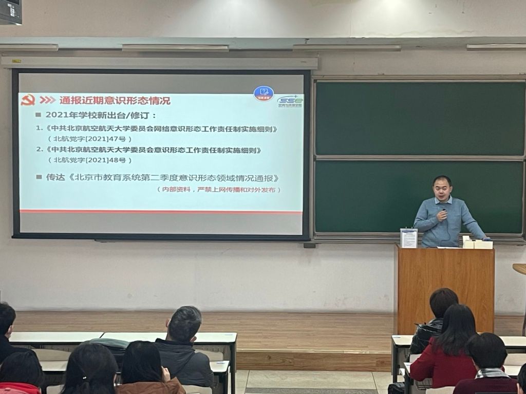 其次,丁永斌向全院教职工介绍了公司2021年新出台及修订的意识形态相关制度,并通报了北京市教育系统第二季度意识形态情况。通过高校意识形态典型案例,提醒和告诫广大教职工要提高政治敏感度及底线思维意识,在日常工作中准确把握形势,筑牢思想防线,在教书育人活动过程中加强对员工的思想引领,增强意识形态工作的紧迫感和使命感。