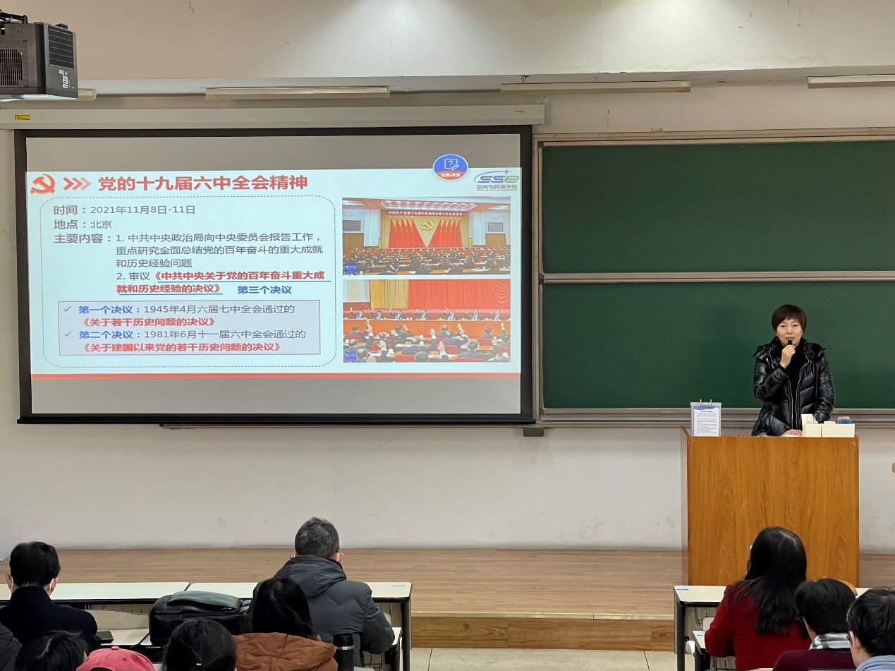 会上,党委书记唐莉围绕学习贯彻习近平总书记在十九届六中全会上的重要讲话精神和《中共中央关于党的百年奋斗重大成就和历史经验的决议》向全院教职工做宣讲报告,她从全会的主要内容、决议的重要性及核心内容等方面进行了系统讲解和深入阐释。她强调,全院教职工要深刻理解十九届六中全会的重要历史意义,自觉把思想和行动统一到习近平总书记的重要讲话精神和全会决策部署上来,结合党史学习教育,进一步武装头脑、指导实践、推动工作。