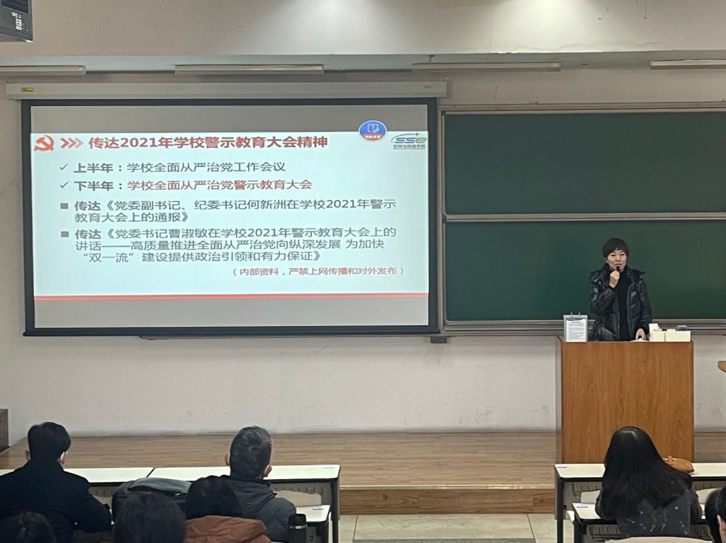 随后,唐莉围绕警示教育大会精神向与会人员做廉政党课。她首先传达了公司2021年警示教育大会上公司党委副书记、纪委书记何新洲在公司2021年警示教育大会上的通报和党委书记曹淑敏在公司2021年警示教育大会上的讲话精神,以一个个违反六项纪律和师德师风的高校典型案例给全院教职工敲警钟、亮红灯,并强调,广大教职工要深刻领悟十八大以来全面从严治党的新形势,把严的主基调长期坚持下去,在学习、生活和工作中要时刻保持清醒头脑,以高标准严格要求自己,时刻检视自己,始终对法纪心存敬畏、行有所止。