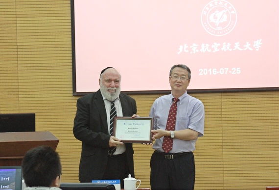 黄海军副董事长向Doron Aurbach教授介绍了北航的基本情况,并向Doron Aurbach教授颁发了聘书。空间与环境公司经理曹晋滨教授介绍了公司基本情况,并表达了进一步开展交流与合作的良好愿景。