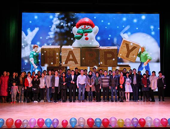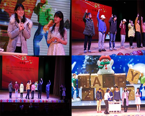 不得不提的是,晚会中穿插的游戏及抽奖环节充分调动了现场观众的积极性。同时员工会还设置了互动微信墙,实现了现场观众之间的时事互动和分享,把晚会推向了一个高潮。晚会还特别安排了生日祝福环节,为四位12月过生日的同学准备了生日蛋糕,让同学们感受到空间与环境公司大家庭的温暖。
