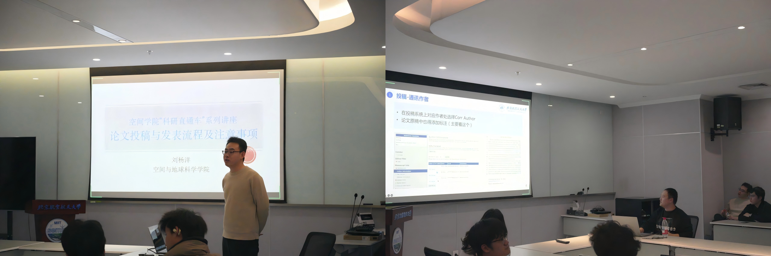 首期讲座于2025年12月10日在国实D1026会议室开讲,准聘副教授刘杨洋与优秀员工王瑞慧联袂带来《论文投稿与发表流程》专题分享。刘老师立足科研工作者成长发展全周期,深刻阐释学术论文的核心价值——短期而言,论文是研究生评奖评优、顺利毕业的硬性指标;长期来看,更是科研工作者申请基金项目、晋升专业职称的重要依据,是衡量科研能力的客观标尺。围绕期刊选择这一核心问题,刘老师提炼出四大关键考量维度:期刊影响因子与分区、办刊范围与研究方向契合度、稿件接收率与发表周期、责任编辑研究领域匹配度,为同学们期刊选择提供精准指引。王瑞慧同学则聚焦投稿全流程实操要点,以APJ期刊投稿系统为例展开细致讲解。他建议同学们优先选用LaTeX撰写论文,从源头规避Word排版的常见问题,并着重强调通讯作者标注规范、基金项目信息填写等注意事项。针对审稿环节,他特别指出推荐审稿人的重要性,建议优先选择同领域研究成果丰硕、文献引用频次较高的资深学者。