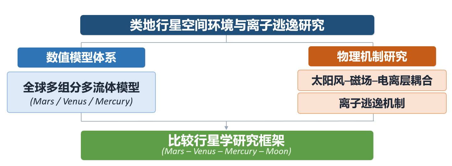 类地行星空间环境研究是国际空间物理与行星科学的重要前沿方向,对于理解行星大气演化与宜居性变化具有重要意义。太阳风与行星高层大气和电离层相互作用能够驱动大气离子逃逸,是影响类地行星环境长期演化的关键物理过程。随着天问一号、嫦娥工程及未来深空探测任务的实施,建立自主可控的行星空间环境数值模型体系已成为支撑我国深空探测任务科学研究与数据分析的重要关键技术。
