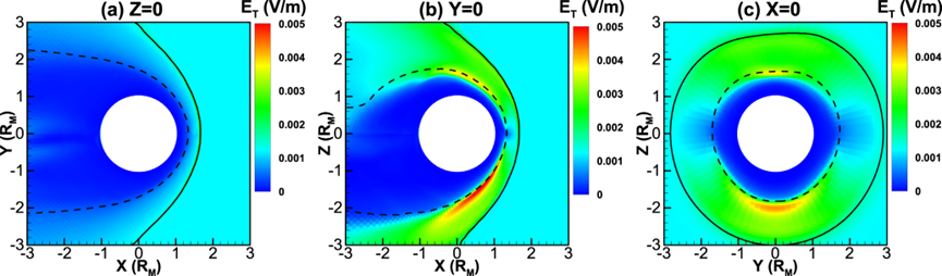 系统研究火星地壳剩磁对磁层结构的控制作用,发现火星南半球强剩磁结构能够改变局部磁场拓扑结构,并通过改变Hall电场和运动电场分布影响离子输运路径。相关研究还揭示了火星磁堆积边界(MPB)的离子尺度结构、磁鞘区域非对称结构,提出火星日侧looping磁场结构形成机制。相关成果发表于GRL、ApJ等期刊,累计引用40余次。