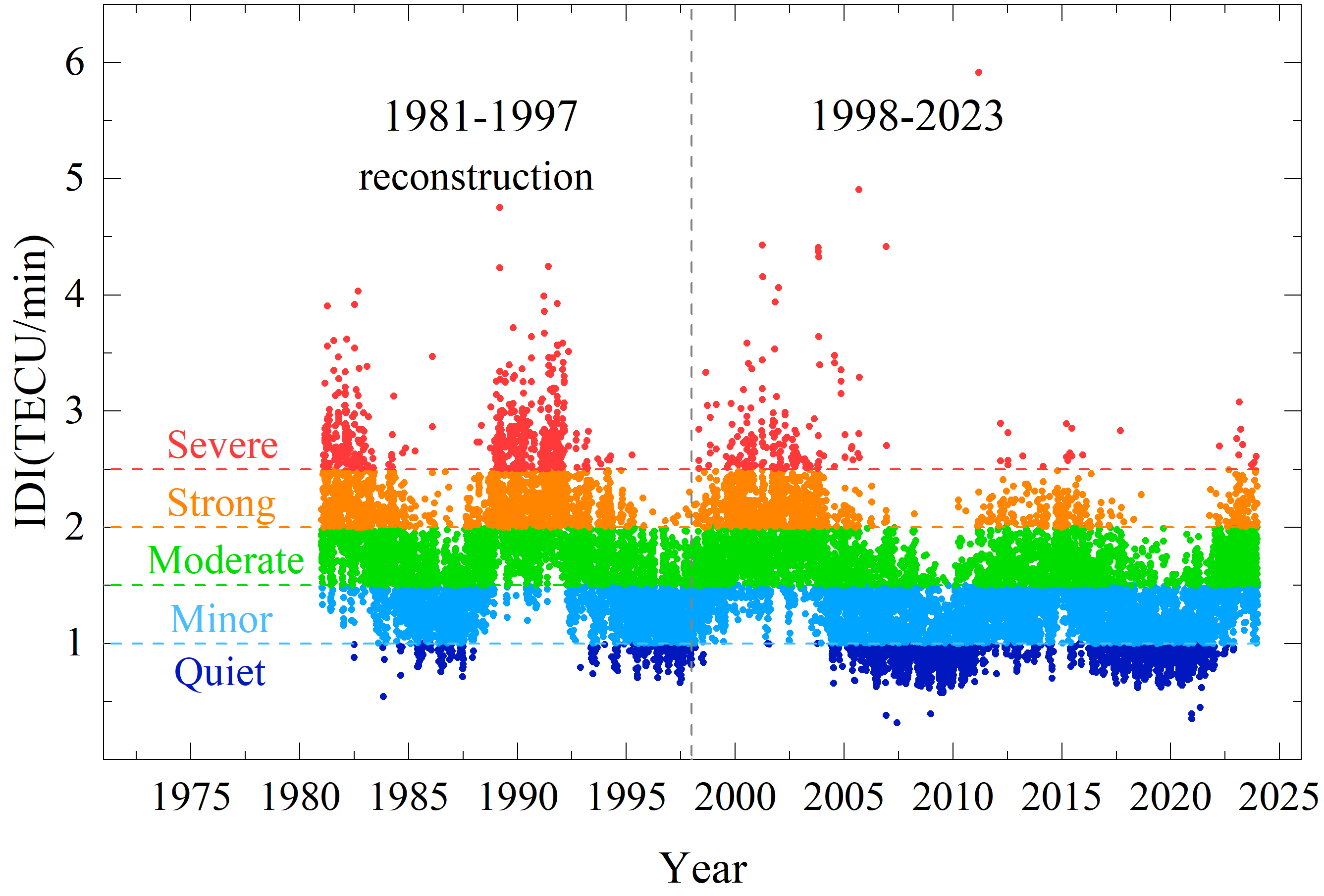3. 提出电离层扰动指数(Ionospheric Disturbed Index, IDI)表征电离层扰动状态。根据IDI数值大小划分为平静、微扰、扰动、强烈扰动、严重扰动五个等级形容不同程度的电离层扰动。详见 https://doi.org/10.1029/2025SW004445