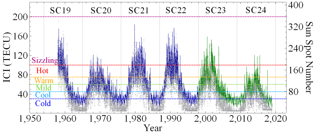 2. 提出电离层天气指数(Ionospheric Climate Index, ICI)表征电离层状态。根据ICI数值大小划分为寒冷、冷、温和、温暖、热和炎热六个等级来形容不同级别的电离层天气。详见 https://doi.org/10.1029/2020SW002596